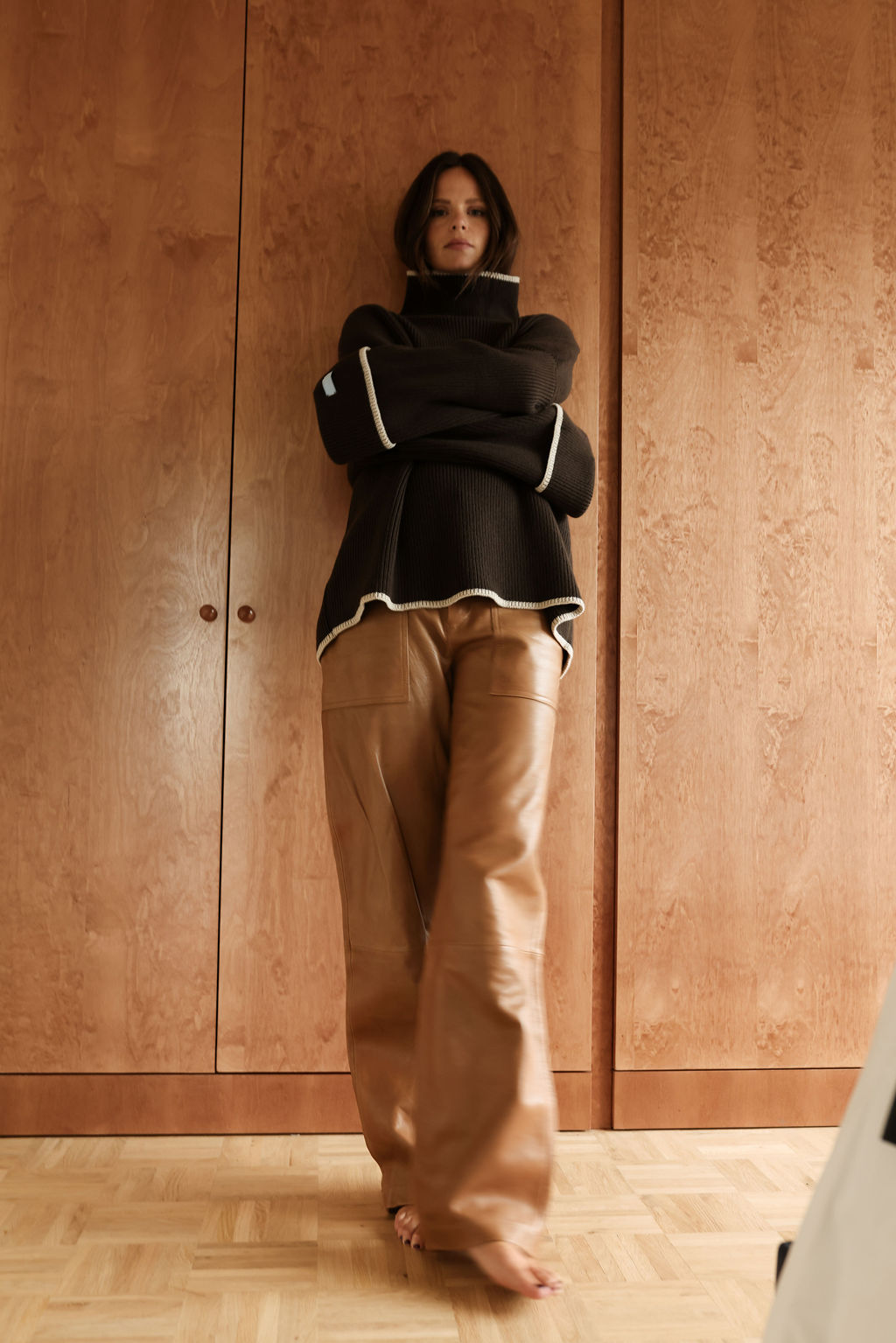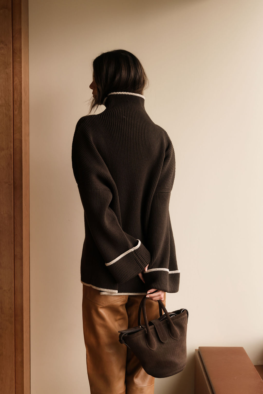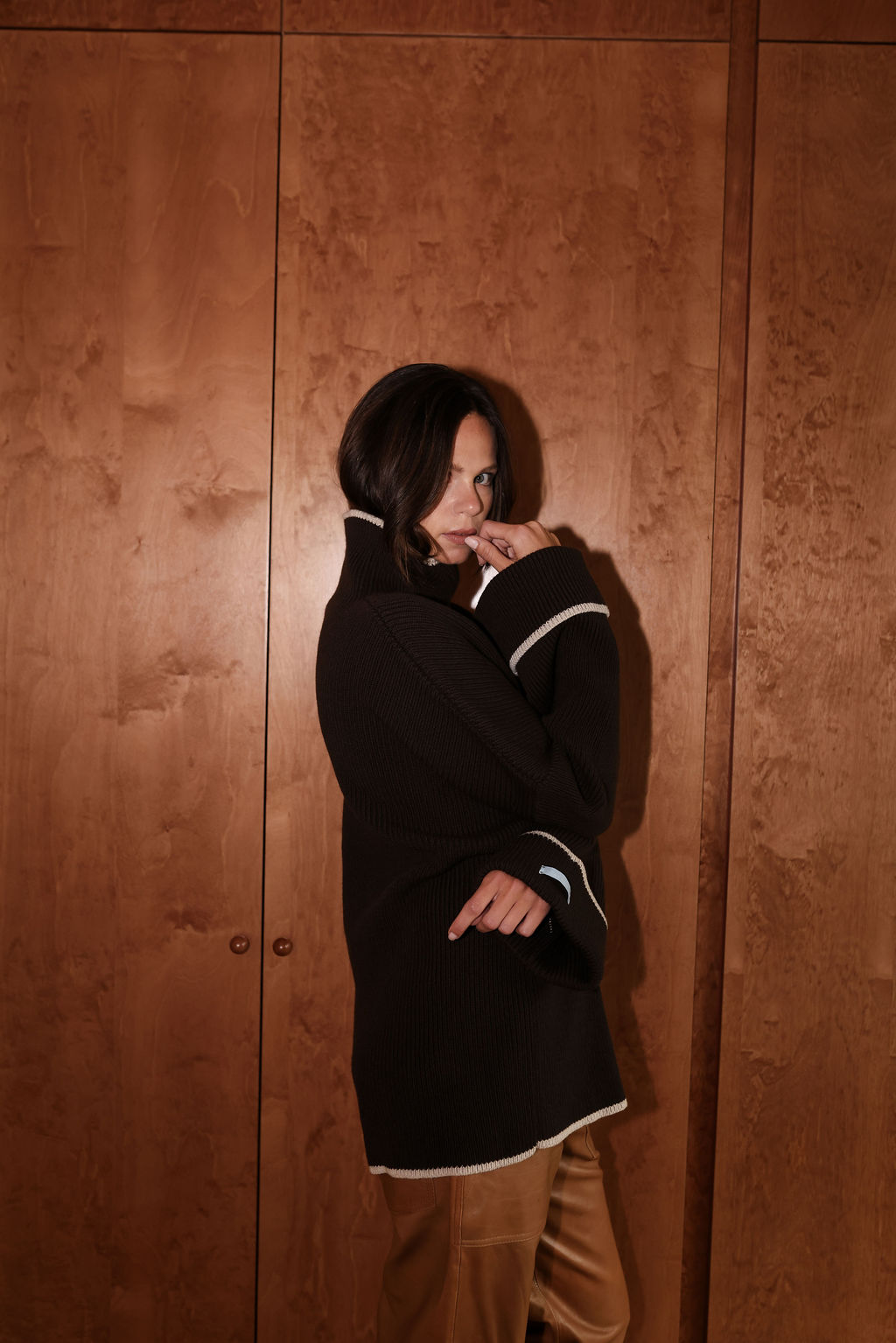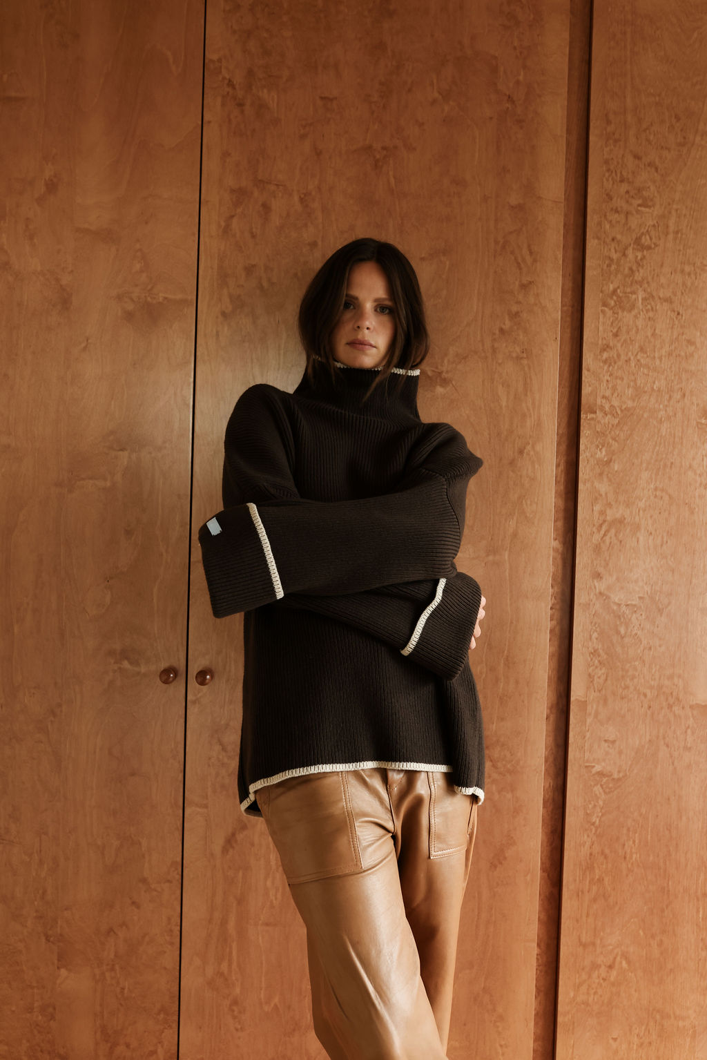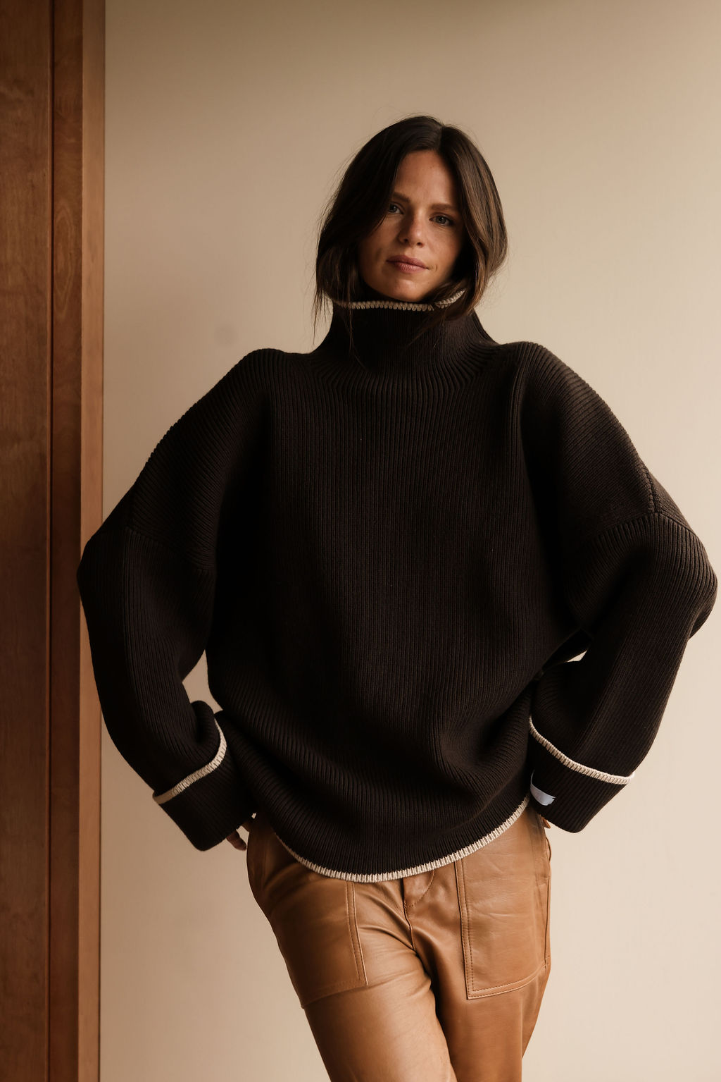 Plongez dans l’élégance minimaliste avec ce pull en laine mérinos ultra-fine, confectionné avec soin en Belgique. Sa coupe ample et confortable, sublimée par un col cheminée structuré et des manches longues aux finitions contrastées, incarne un style à la fois moderne et intemporel.Le tricotage dense assure une chaleur naturelle sans alourdir la silhouette, tandis que les détails en bord-côte ivoire apportent une touche de raffinement subtil. Parfait pour les journées fraîches, ce pull est une pièce forte qui se porte aussi bien avec un pantalon en cuir qu’un jean brut.