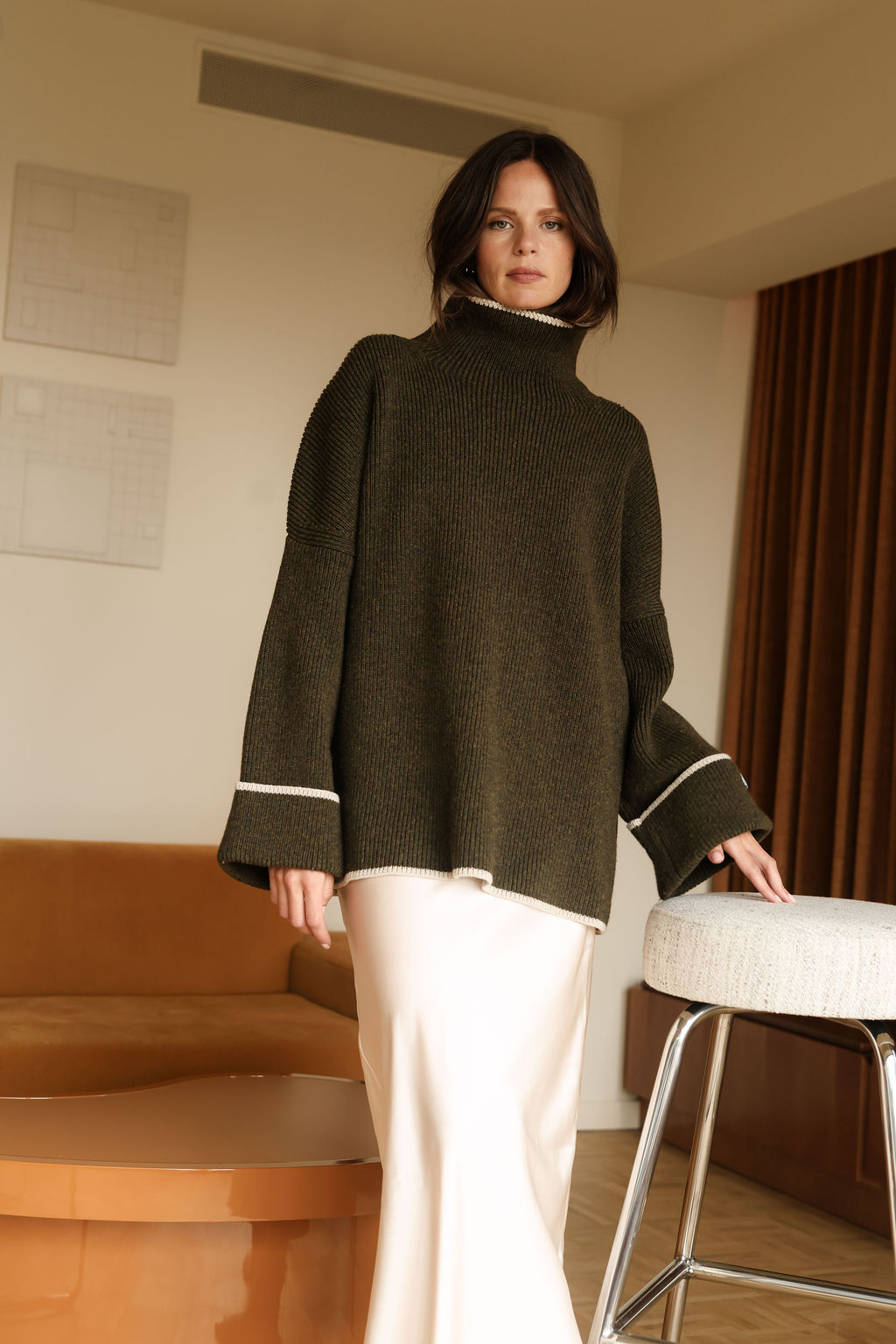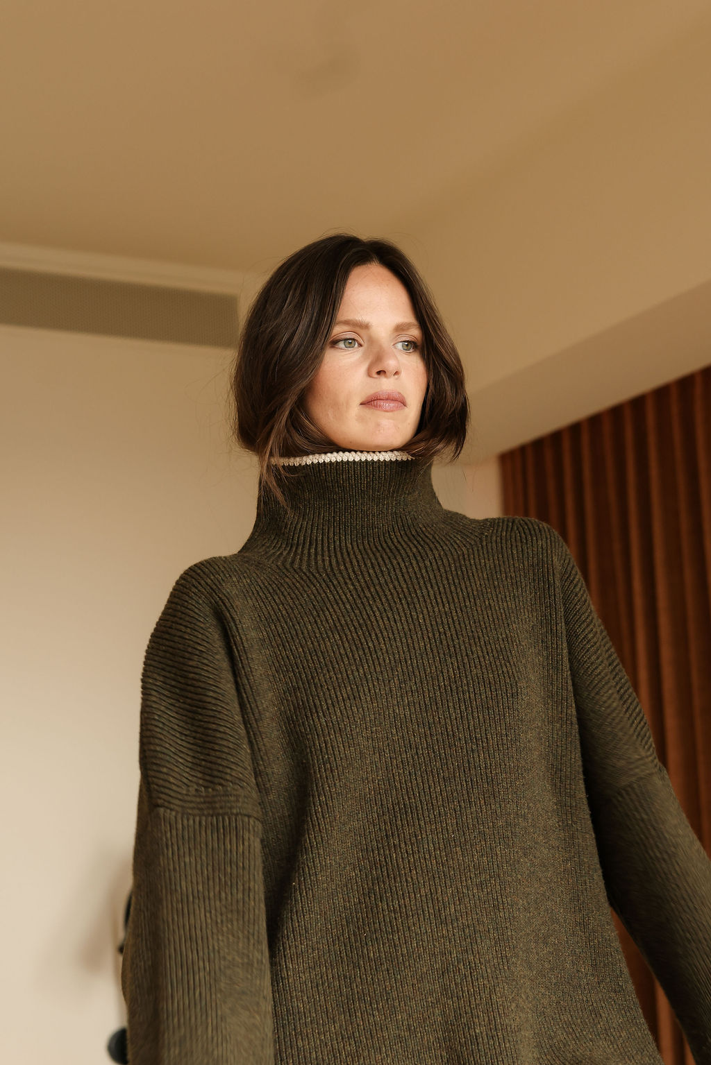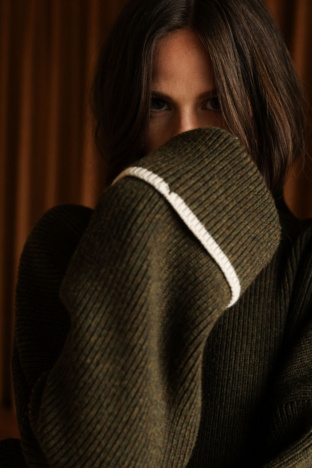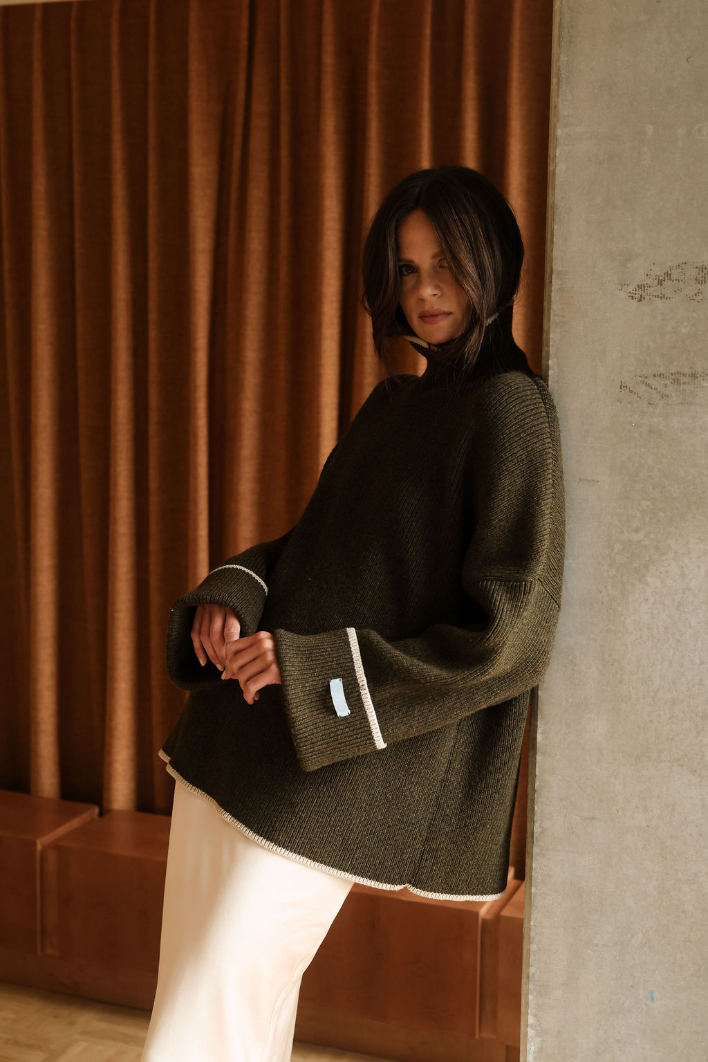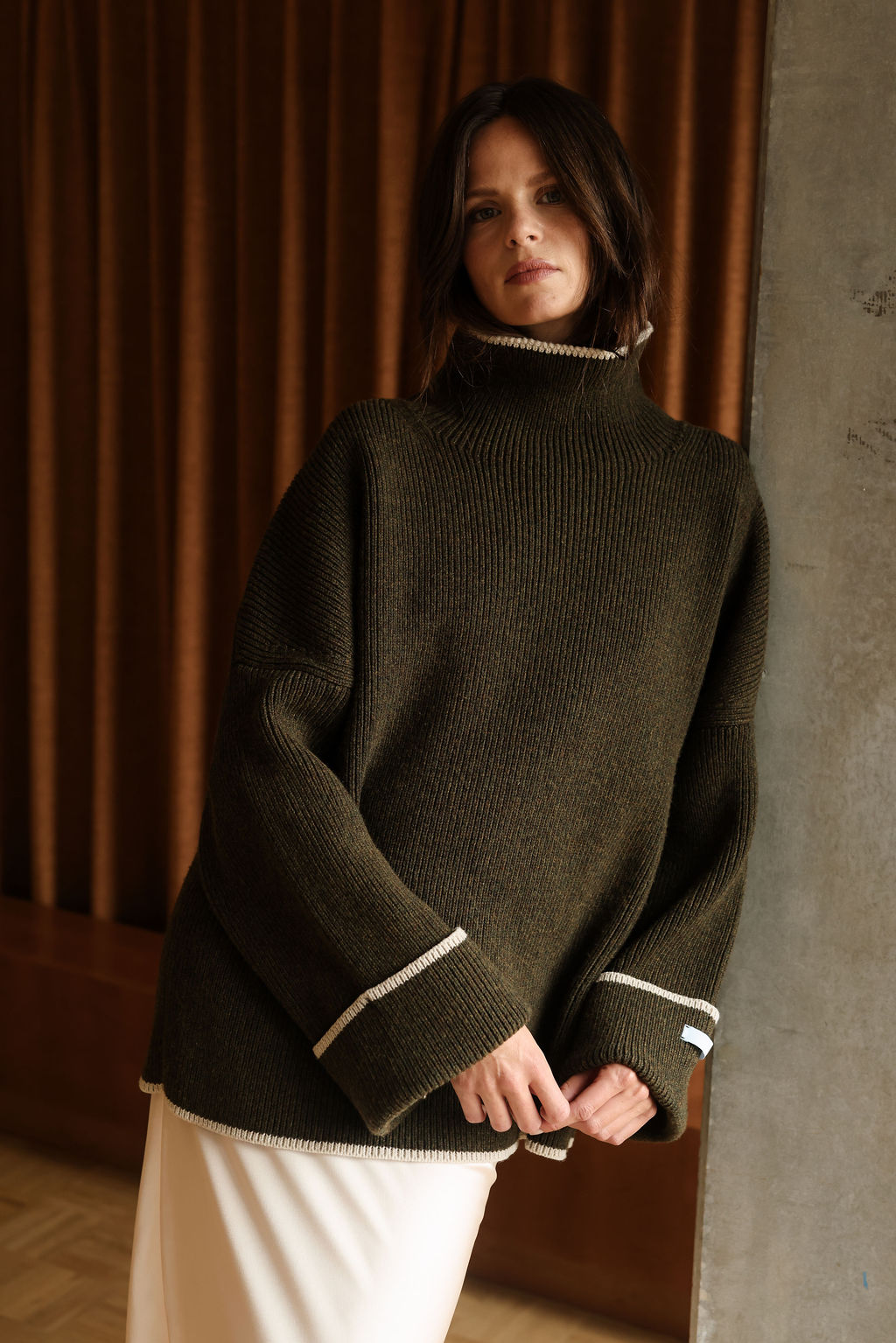 Plongez dans l’élégance minimaliste avec ce pull en laine mérinos ultra-fine, confectionné avec soin en Belgique. Sa coupe ample et confortable, sublimée par un col cheminée structuré et des manches longues aux finitions contrastées, incarne un style à la fois moderne et intemporel.Le tricotage dense assure une chaleur naturelle sans alourdir la silhouette, tandis que les détails en bord-côte ivoire apportent une touche de raffinement subtil. Parfait pour les journées fraîches, ce pull est une pièce forte qui se porte aussi bien avec un pantalon en cuir qu’un jean brut.
